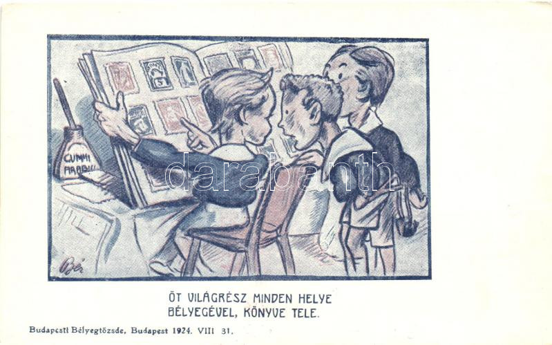Öt világrész minden helye bélyegével, könyve tele; Budapesti Bélyegtőzsde reklám lapja / Hungarian stamp collectors advertisement card, So. Stpl s: Bér (EK)