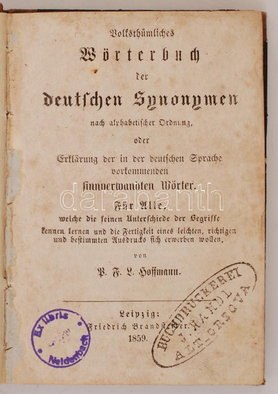 Hoffmann, P[eter], F[riedrich] L[udwig]: Volksthümliches Wörterbuch de... https://www.darabanth.com/de/257-Fernauktion/257.0/Bucher/Bucher-Andere-Sprachen~600346/Hoffmann-Peter-Friedrich-Ludwig-Volksthumliches-Worterbuch-der-deutschen-Synonymen-Leipz~II1263630