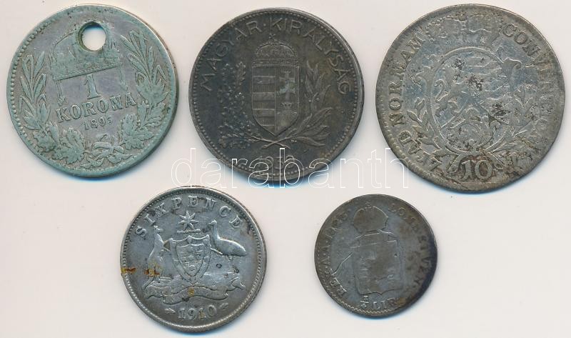 Beschreibung: 5db-os vegyes magyar és külföldi rossz minőségű ezüstpénz tétel