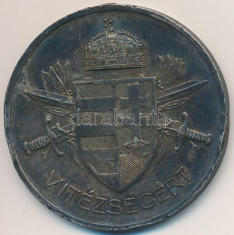 1939. "Magyar Kis Ezüst Vitézségi Érem" jelzett Ag kitüntetés fül és mellszalag nélkül. Szign.: BERÁN L. T:2- ph.,patina Hungary 1939. "Small Hungarian Silver Gallantry Medal" hallmarked Ag medal without ear and ribbon. Sign.: BERÁN L. C:VF edge error, patina