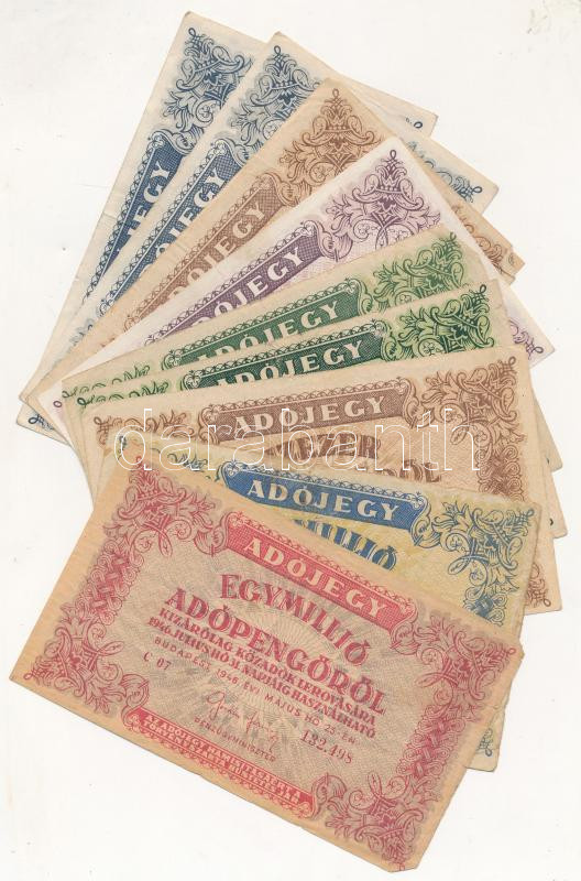 1946. 10db-os vegyes magyar adópengő bankjegy tétel, közte fordított c... https://www.darabanth.com/de/257-Fernauktion/257.0/Numismatik/Ungarische-Banknoten~200007/1946-10db-os-vegyes-magyar-adopengo-bankjegy-tetel-kozte-forditott-cimeres-is-Tvegyes~II1262450