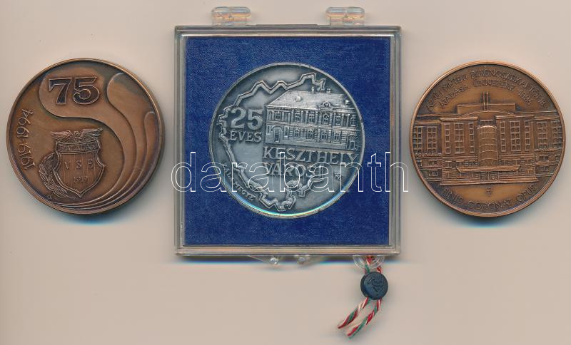 Beschreibung: 3db-os érem tétel: KépÃró Zoltán (1944-1981) 1979. "MÉE-Keszthely / 25 éves Keszthely város" ezüstözött Br érem (42,5mm) + 1994. "Sopron Megyei Jogú Város Kórház / Az új Műtéti Diagnosztikai Tömb átadása ünnepére" Br érem szignóval (42,5mm) + 1994. "75 éves a Haladás VSE" Br érem szignóval (42,5mm) T:1-,2