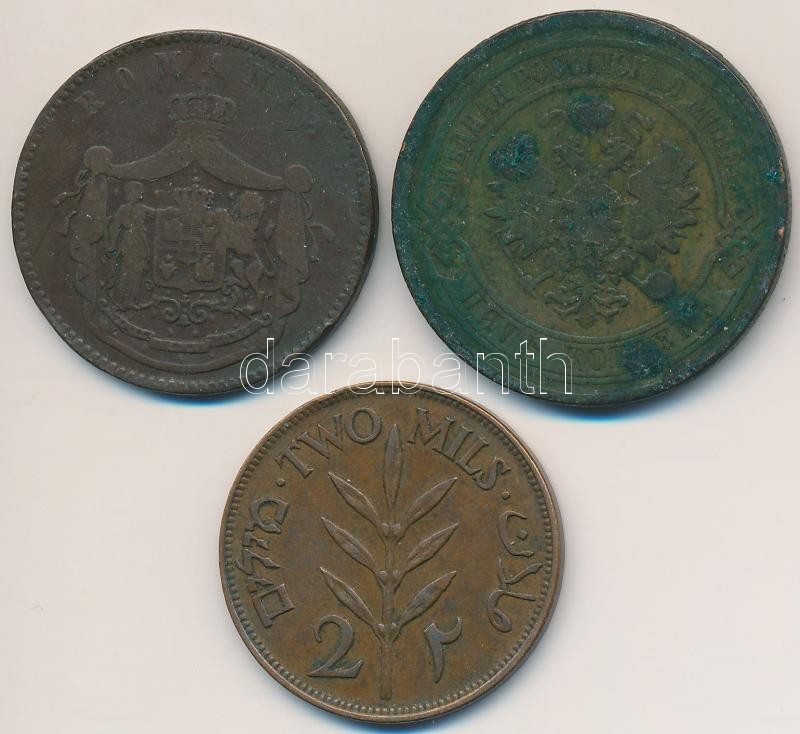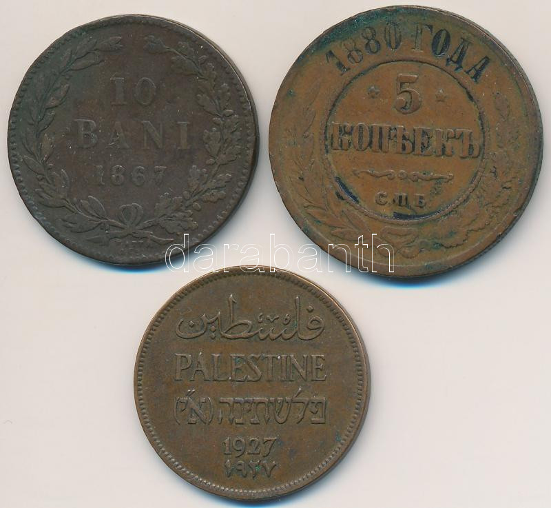 Mixed: Romania 1867. 10 Bani Cu "Watt & Co." + Russian Empire 1880. 5 Kopeks Cu + Palestine 1927. 2 Mils Br C:VF,F