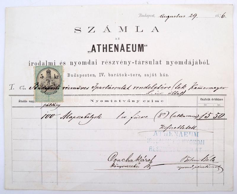 Beschreibung: 1876 Számla az "Athenaeum" irodalmi és nyomdai részvény-társulat nyomdájából. Bp., IV. Barátok tere, okmánybélyeggel (5kr), 17x21cm