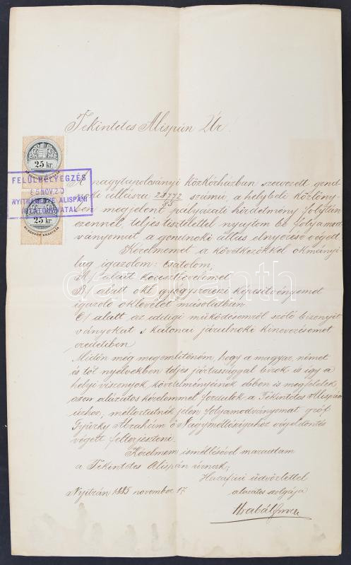 Beschreibung: 1885 Nyitrai gyógyszerész kérvénye a nagytapolcsányi kórház gondoki állásért