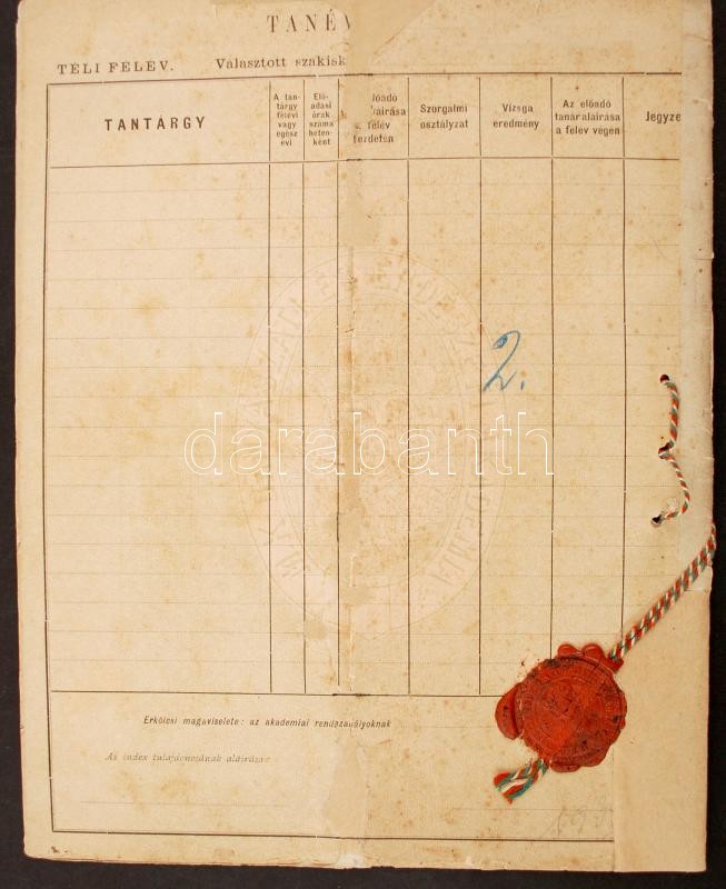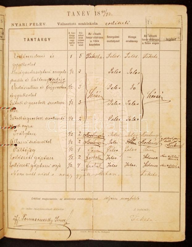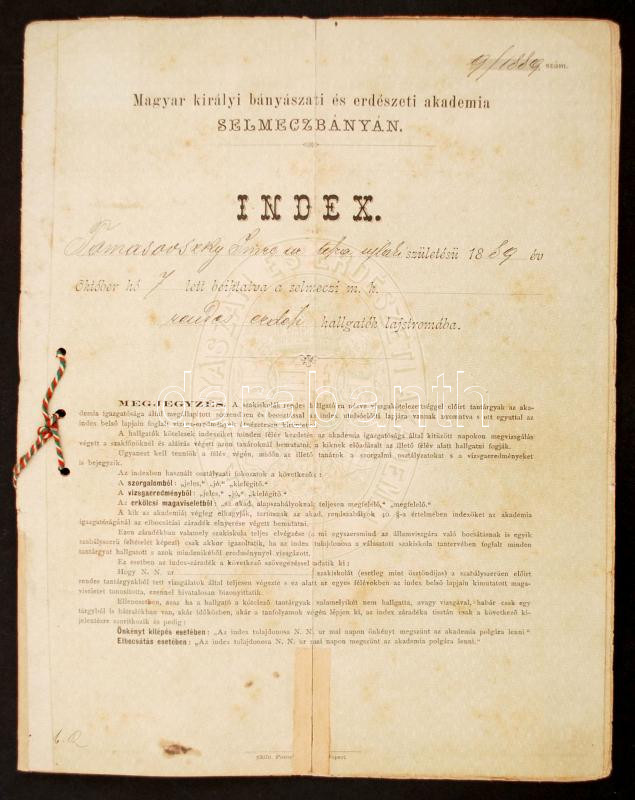 1889 Tomasovszky Imre (1871-1946) m. kir. főerdész, a selmeczbányai akadémia egykori tanárának indexe a Selmeczbányai bányászati bányászati és erdészeti akadémiáról 1889-1892 az akadémia tanárainak aláírásával és viaszpecsétjével, restaurált, 29x22cm