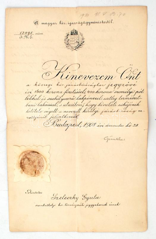 Beschreibung: 1908 Járásbírósági jegyzői kinevezés Günther Antal igazságügyminiszter saját kezű aláírásával