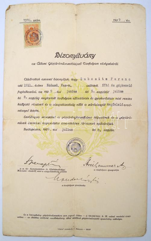 Beschreibung: 1939 Bp., Gépjárművezetői engedély, bizonyítvány az Állami Gépjárművezetőképző Tanfolyam sikeres elvégzéséről.