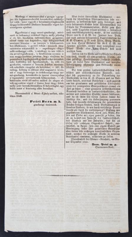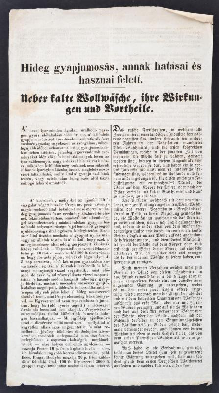 Beschreibung: 1840 Hideg gyapjumosás, annak hatásai és hasznai felett, hirdetmény magyar és angol nyelven, 37x20cm