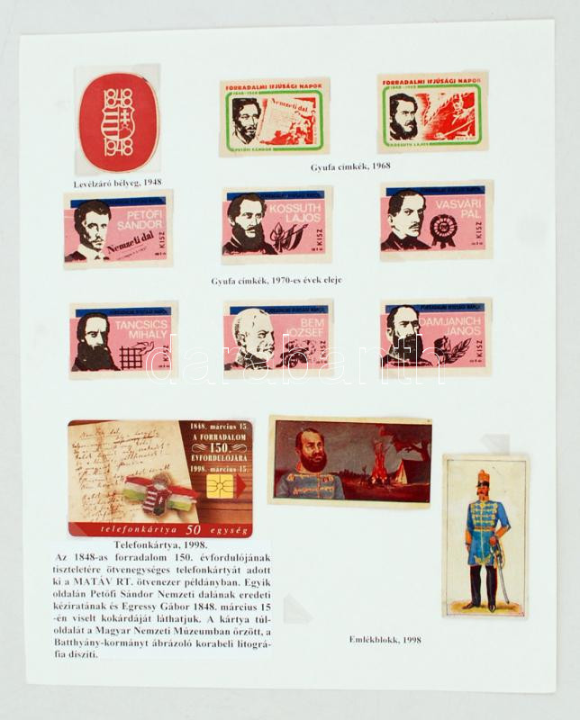 Beschreibung: 1848-as gyűjtemény: gyufacímkék, telefonkártya, levélzáró, gyűjtőkép