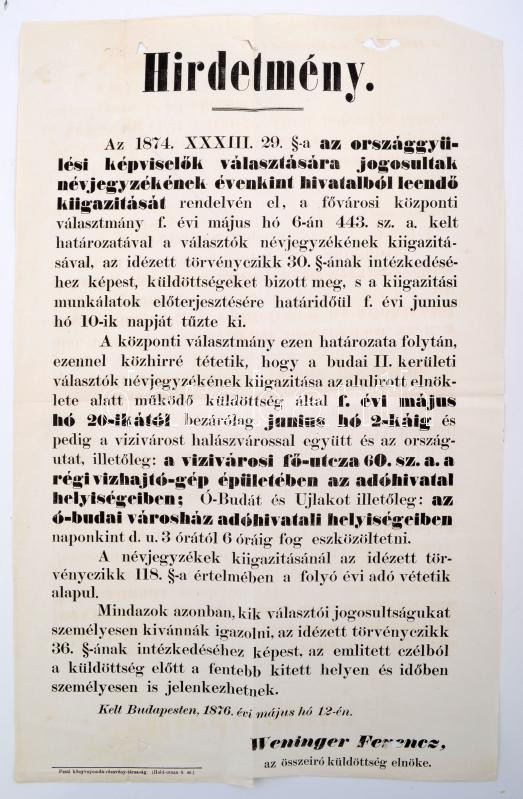 1876 Hirdetmény választási névjegyzékbe való összeírásról. https://www.darabanth.com/de/258-Fernauktion/258.0/Andere-Sammelgebiete/Drucksachen~26/1876-Hirdetmeny-valasztasi-nevjegyzekbe-valo-osszeirasrol~II1267788