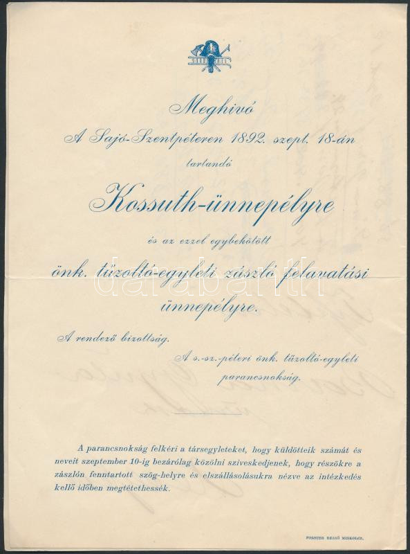 1892 Sajószentpéter Kossuth ünnepély és tűzoltóegyleti zászló felavatá... https://www.darabanth.com/de/258-Fernauktion/258.0/Andere-Sammelgebiete/Drucksachen~26/1892-Sajoszentpeter-Kossuth-unnepely-es-tuzoltoegyleti-zaszlo-felavatas-meghivoja~II1266672