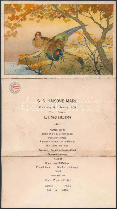 1930 Az amerikai Japán S.S. Hakone Maru hajó menükártyája. Illusztrált... https://www.darabanth.com/de/258-Fernauktion/258.0/Andere-Sammelgebiete/Drucksachen~26/1930-Az-amerikai-Japan-SS-Hakone-Maru-hajo-menukartyaja-Illusztralt-Illustrated-menu-card~II1265784