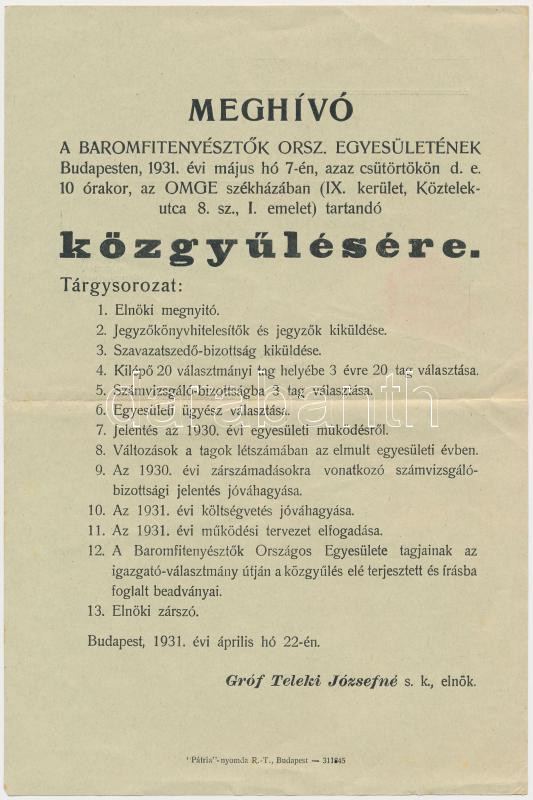 1931 Meghívó a Baromfitenyésztők Országos Egyesületének közgyűlésére. https://www.darabanth.com/de/258-Fernauktion/258.0/Andere-Sammelgebiete/Drucksachen~26/1931-Meghivo-a-Baromfitenyesztok-Orszagos-Egyesuletenek-kozgyulesere~II1271492