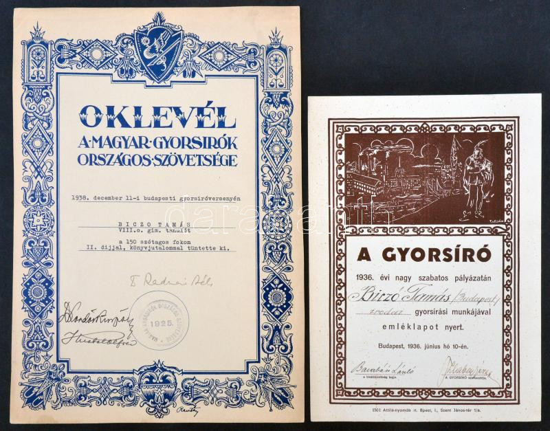 Beschreibung: 1936, 1938 2 db "Gyorsíró" oklevél pályázaton és gyorsíróversenyen elért eredményért