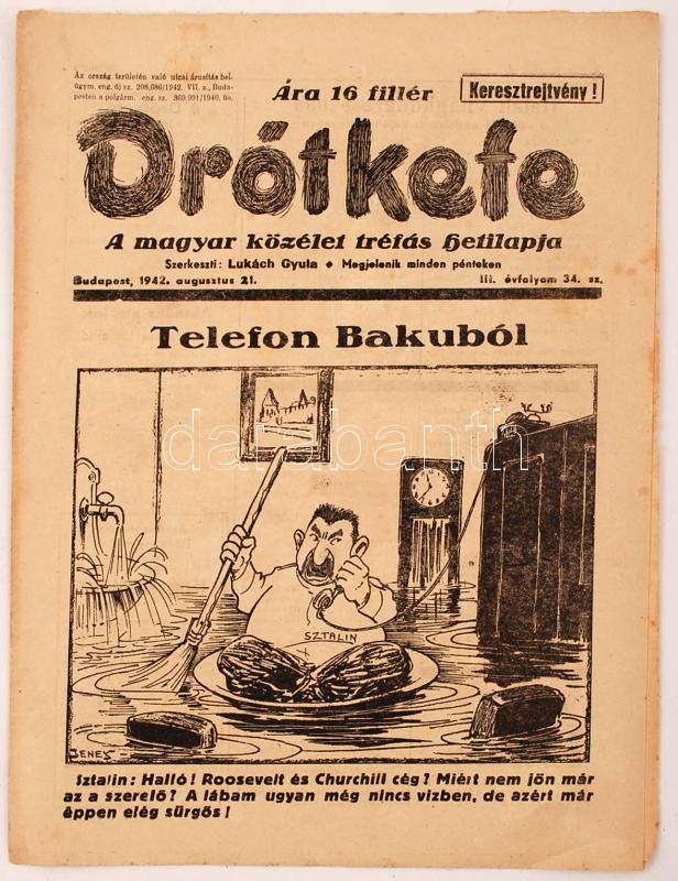 1942-43 Drótkfefe, A magyar közélet tréfás hetilapja, szerk.:Lukách Gy... https://www.darabanth.com/de/258-Fernauktion/258.0/Andere-Sammelgebiete/Drucksachen~26/1942-43-Drotkfefe-A-magyar-kozelet-trefas-hetilapja-szerkLukach-Gyula-3-szama-pp8-32~II1249619