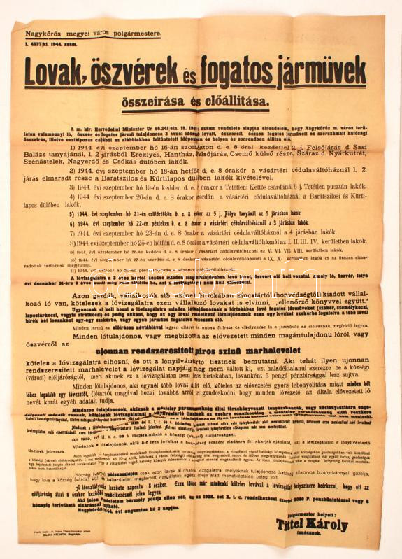 1944 Nagykőrös megyei város polgármestere által kiadott nagyméretű hir... https://www.darabanth.com/de/258-Fernauktion/258.0/Andere-Sammelgebiete/Drucksachen~26/1944-Nagykoros-megyei-varos-polgarmestere-altal-kiadott-nagymeretu-hirdetmeny-a-lovak-oszv~II1272090