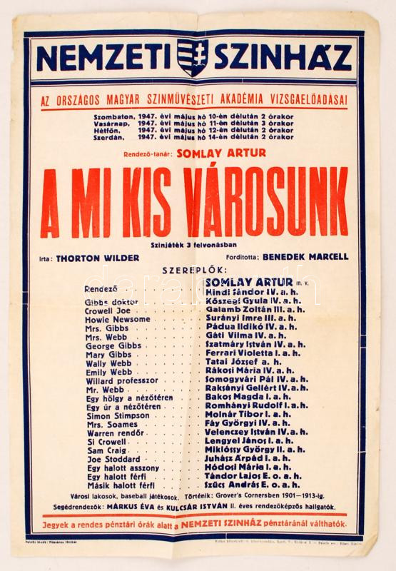 1947 A Nemzeti Színházban játszott "A mi kis városunk" című színdarab ... https://www.darabanth.com/de/258-Fernauktion/258.0/Andere-Sammelgebiete/Drucksachen~26/1947-A-Nemzeti-Szinhazban-jatszott-A-mi-kis-varosunk-cimu-szindarab-plakatja-hajtott-42x~II1268146