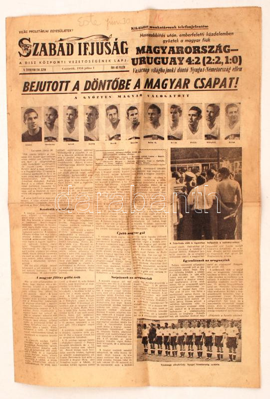1954 Szabad Ifjúság V. évfolyamának 154. száma, címlapon a Magyarorszá... https://www.darabanth.com/de/258-Fernauktion/258.0/Andere-Sammelgebiete/Drucksachen~26/1954-Szabad-Ifjusag-V-evfolyamanak-154-szama-cimlapon-a-MagyarorszagAranycsapat-Uruguay~II1266948
