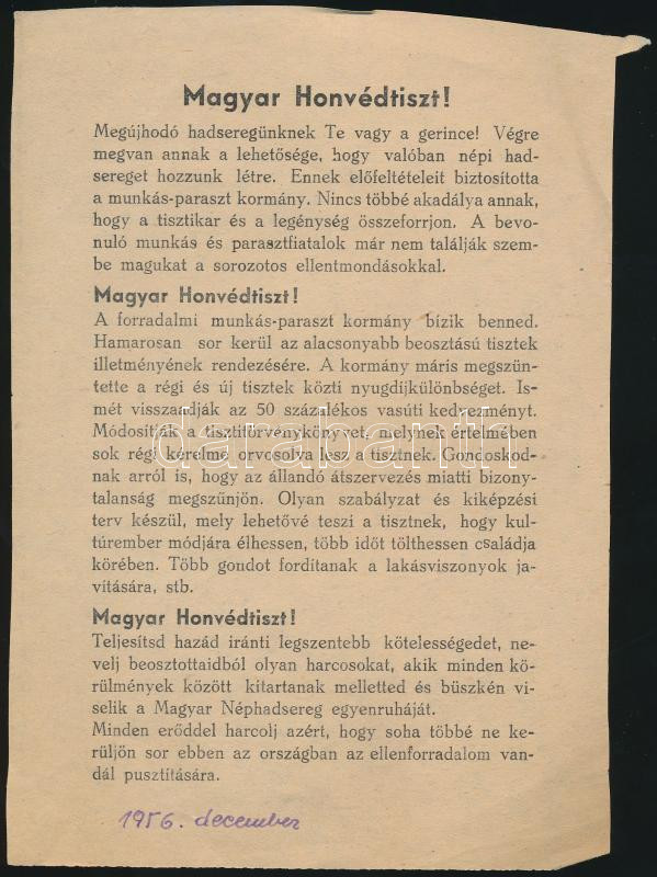 1956 Magyar Honvédtiszt! forradalmi röplap apró szakadással, 16x12cm https://www.darabanth.com/de/258-Fernauktion/258.0/Andere-Sammelgebiete/Drucksachen~26/1956-Magyar-Honvedtiszt-forradalmi-roplap-apro-szakadassal-16x12cm~II1252119