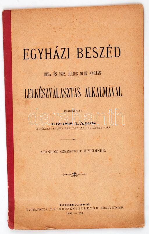 Erőss Lajos: Egyházi beszéd írta és 1892. július 10-ik napján lelkészválasztás alkalmával elmondta - - Debreczen, 1982, "Debreczeni ellenőr". Papírkötésben.