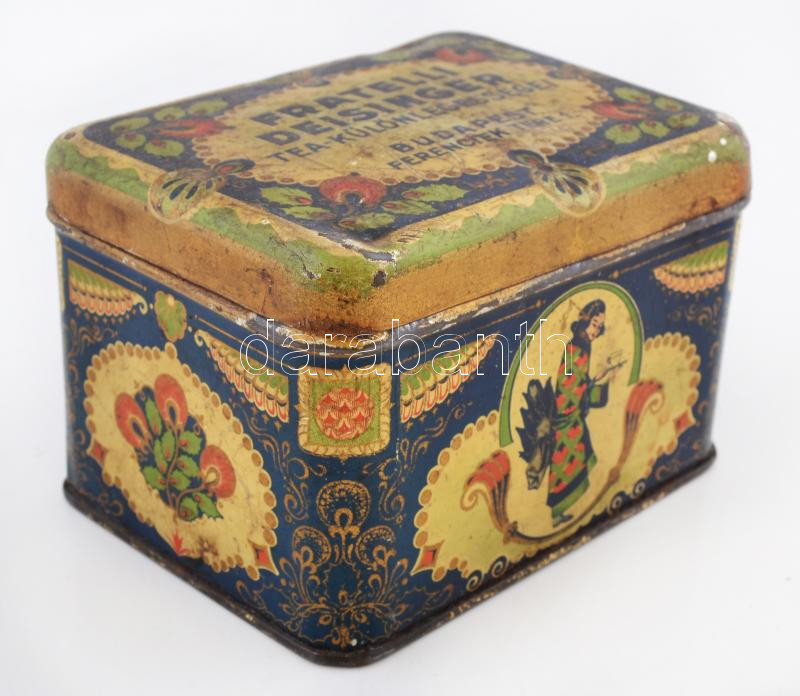 Beschreibung: Fratelli Deisinger Tea-különlegességei, Bp., Ferenciek tere 1., illusztrált fémdoboz,12x9x8cm