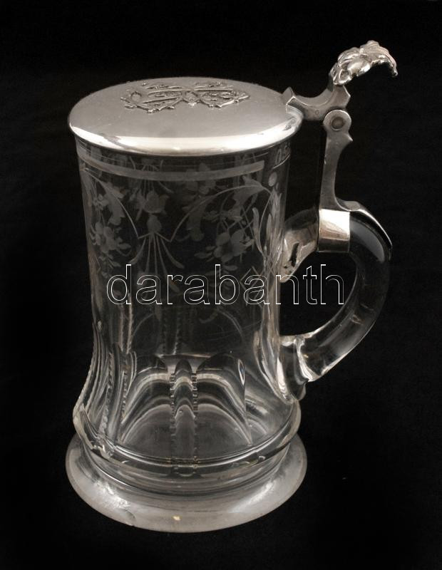 Beschreibung: Söröskorsó ezüstözött alpakka tetővel (monogrammal), üveg test gravírozott, apró csorbával, m:17 cm
