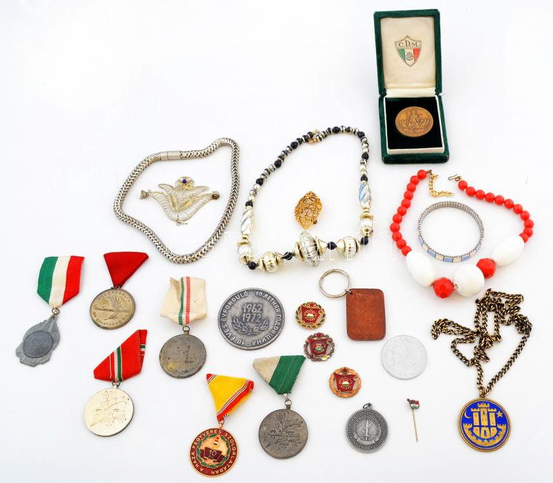 Beschreibung: Vegyes bolhatétel: Vegyes bizsuk 6 db, valamint vegyes kitüntetések, díjérmek, plakettek, 16 db.
