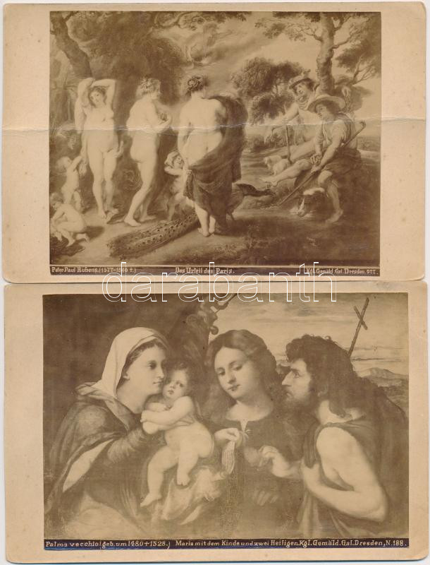 1870-1900 Hölgy portré, keményhátú kabinetfotó Central Ateleieret Koppenhágai műterméből, 11x6cm valamint cca 1905 Keményhátú festményfotó a drezdai múzeumból (P. Vecchio és Rubens festményei),hibásak, 17x11cm