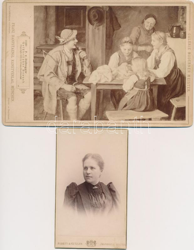 1880-1900 Hölgy portré, keményhátú kabinetfotó Righetti és Ketzler innsbrucki műterméből, cca 11x6cm; valamint cca 1905 Keményhátú festményfotó a müncheni modern galériából, F. v. Defregger műve, 17x11cm