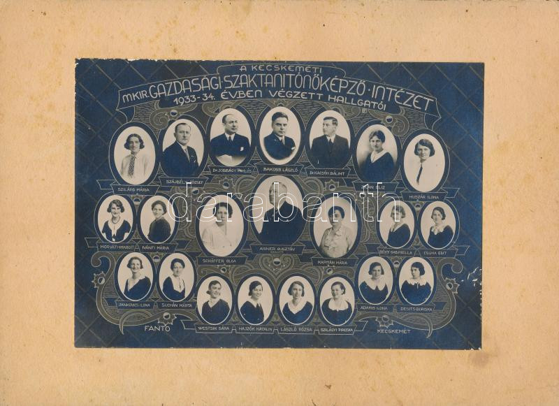 1934 Kecskemét, mkir. Gazdasági Szaktanítóképző Intézet végzett hallgatóinak kistablója, 22 nevesített portréval, Fanto fényképész műterméből, hátoldalon aláírásokkal, 12x17 cm, karton 17x23 cm