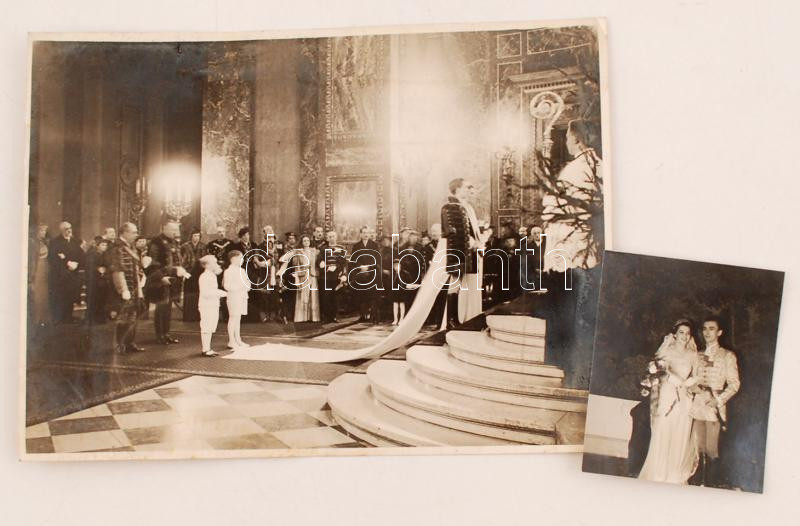 1939 Fotók Báró Podmaniczky István és Szinyei Merse Piroska esküvőjéről előkelő résztvevőkkel, Jakab Sánodr ill., Macsi andrás budapesti fényképesz pecsétjével, 2db, 8x7cm, 17x23cm