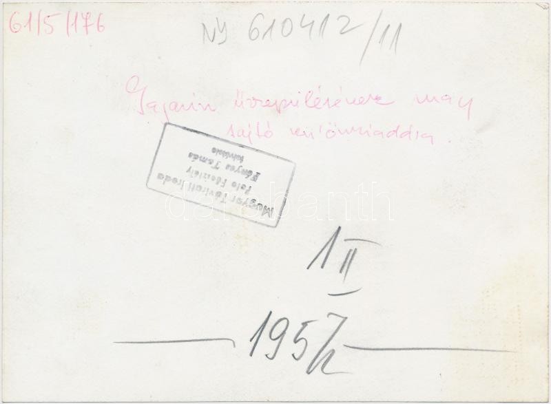 1961 Az Esti Hírlap rendkívüli kiadását vásárló emberek, amelyben Gagarin űrrepülésének hírét közlik 1961 április 13-án. Fényes Tamás felvétele, a hátoldalán pecséttel jelzett. 18,5x13 cm.