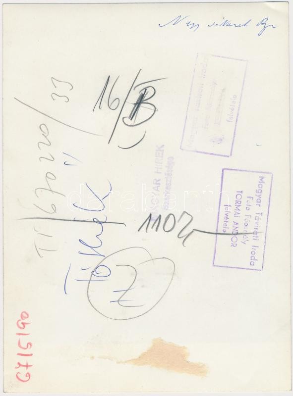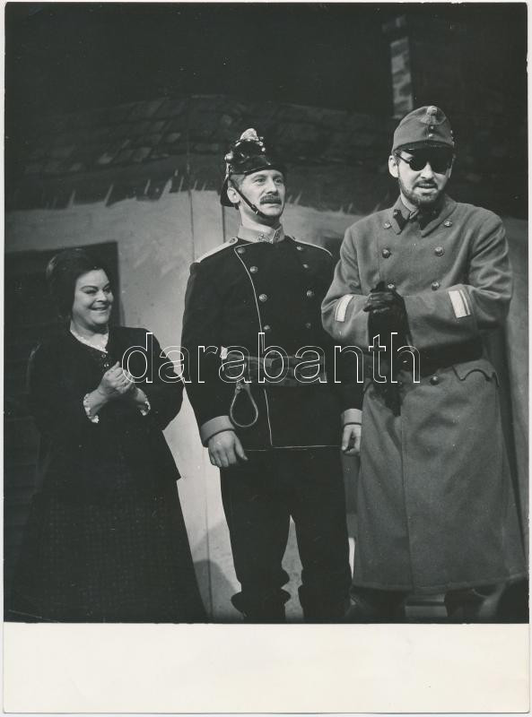 1967 Jelenet Örkény István Tóték c. darabjának ősbemutatójából. A képen Dayka Margit, Nagy Attila és Latinovits Zoltán. Tormai Andor felvétele, a hátoldalon pecséttel jelzett. 18x13,5 cm.