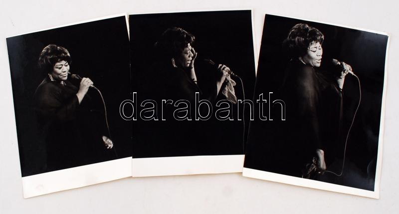 1968 Ella Fitzgerald február 29-i, Erkel Színházban adott első budapesti koncertjén készült 4 db nagyméretű sajtófotó. Vámos László felvételei, feliratozva, hátoldalukon pecséttel jelzettek. 24x18, illetve 18x17 cm.