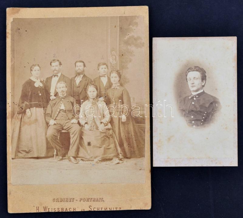 Beschreibung: cca 1870 Selmecbányai család keményhátú fotója, verzón feliratozva, 2db, H. Weissbach ill Rautek Scemnitzi műterméből, 10x6cm és 15x11cm