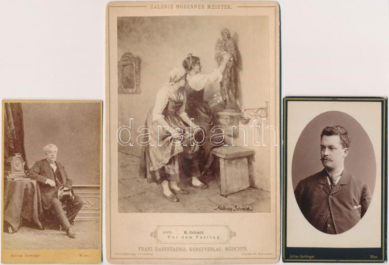 cca 1900 db Keményhátú festményfotó a müncheni modern galériából 17x11cm valamint 1878-1882 Férfi portrék, keményhátú kabinetfotók Julius Gertinger bécsi műterméből, 2db, cca 11x6cm