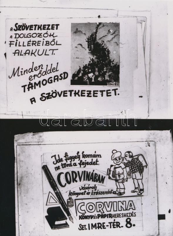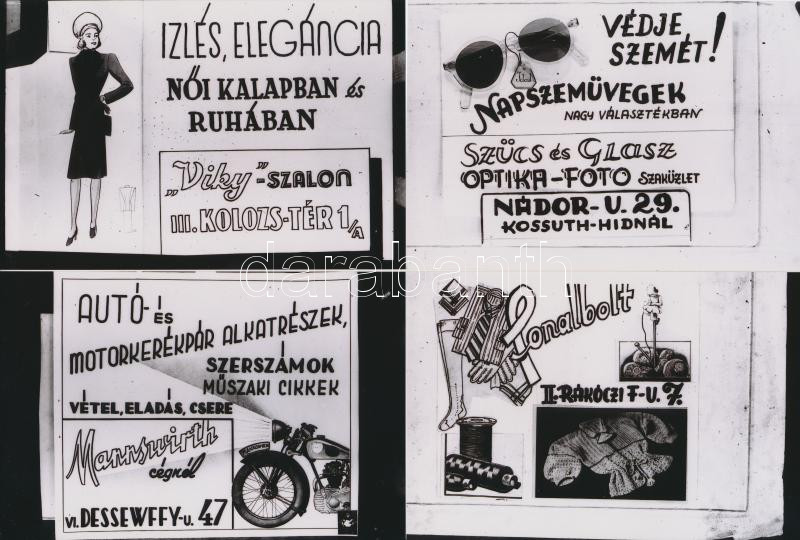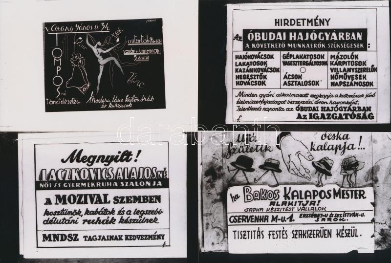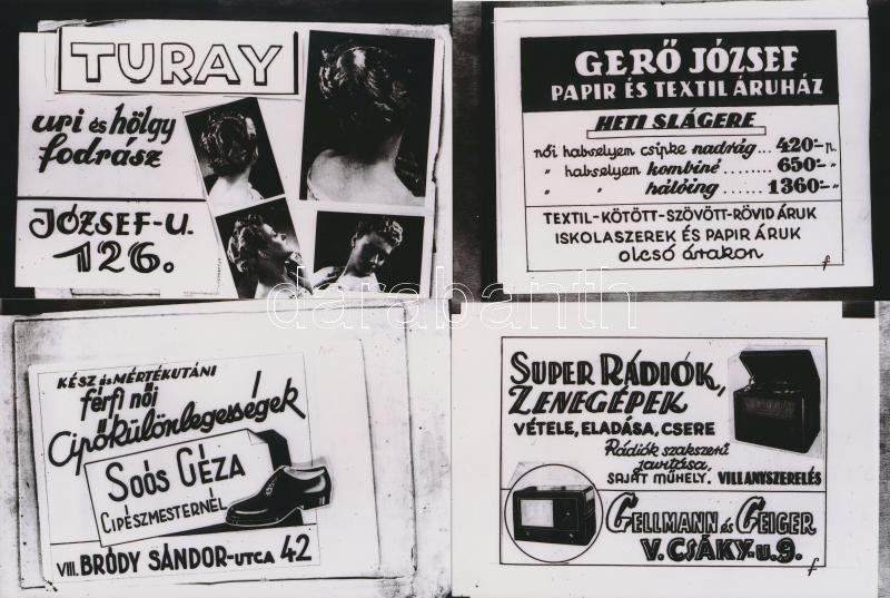 cca 1946 Fekete György (1904-1990) budapesti fényképész reklámgrafikái különféle szolgáltatásokról, termékekről, ezekről készített mozikban vetíthető üveglemez diapozitív képeket, az eladásra kínált tétel 13 db papír- pozitív képet tartalmaz, melyek modern nagyítások a hagyatékában őrzött korabeli negatívokról, 10x15 cm-es fotópapíron
