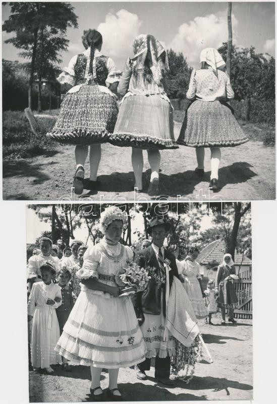 Beschreibung: cca 1973 Régi paraszti esküvő és lakodalom. 3 db fotó. Langer Klára felvételei. A hátoldalon pecséttel.