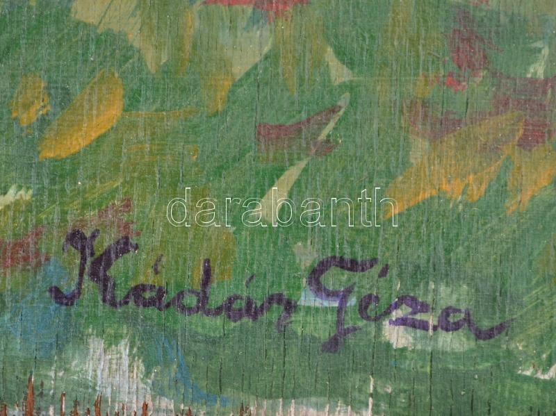 Beschreibung: Kádár jelzéssel: Házak az erdőszélen. Olaj, falemez, 42×52 cm