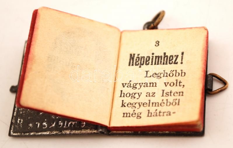 Beschreibung: Ferenc József : Népeimhez! A király szózata a nemzethez 1914. jul. 28. Minikönyv dombornyomott fém borítóval.