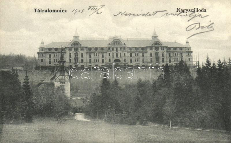 Tátralomnic, Tatranská Lomnica; Nagyszálloda / Grand Hotel https://www.darabanth.com/de/258-Fernauktion/258.0/Ansichtskarten/Slowakei~200028/Tatralomnic-Tatranska-Lomnica-Nagyszalloda-Grand-Hotel~II1266359
