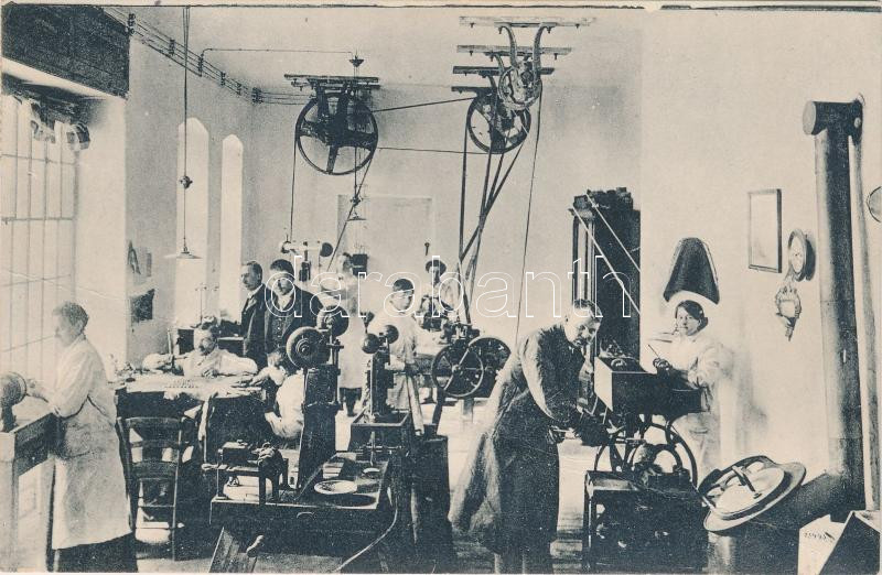 Szávaszentdemeter, Mitrovica, Sremska Mitrovica; Ludwig Griesbach arany és ékszergyára, belső, munkásokkal / Fabrik fugenloser Eheringe nach eigenem Patent Nro. 50420 und Goldwaarenfabrik / Ludwig Griesbach's Goldware workshop interior, manufacturer