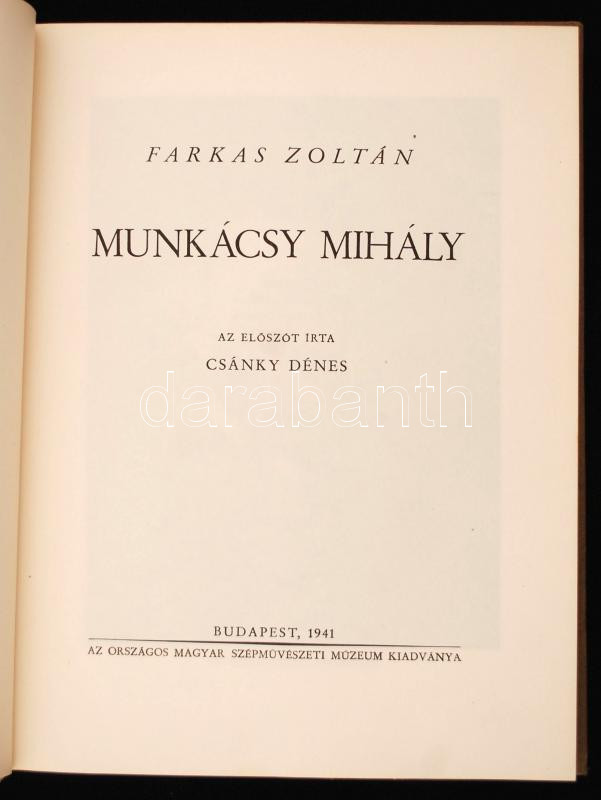 Farkas Zoltán: Munkácsy Mihály. Az előszót írta Csánky Dénes. Bp., 1941, Országos Magyar Szépművészeti Múzeum. Kiadói félvászon kötés, kissé kopott állapotban.