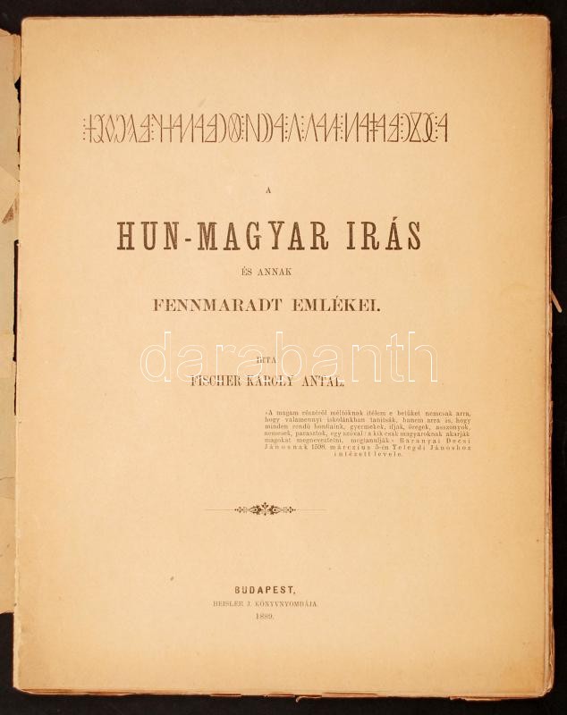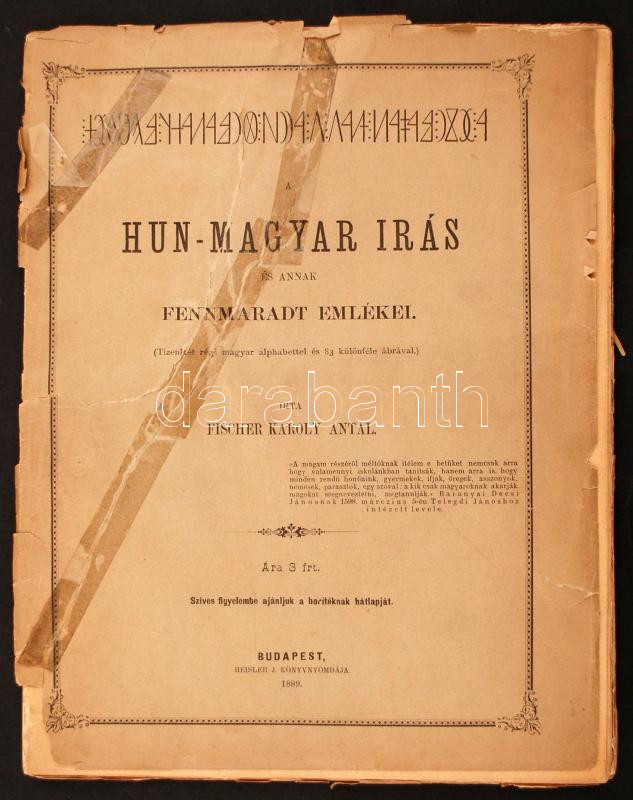 Fischer Károly Antal: A hun-magyar írás és annak fennmaradt emlékei. Bp., 1889. Heisler J. Kiadói, gerincén elszakadt papírkötésben. Belül ép, a fűzés még tart.