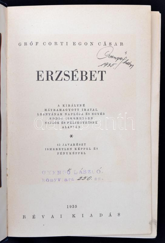 Gr. Corti Egon Cäsar: Erzsébet. A királyné hátrahagyott iratai, leányának naplója és egyéb eddig ismeretlen naplók és feljegyzések alapján. 45 képpel és fényképpel. Bp., 1935, Révai. Kiadói, kissé laza egészvászon-kötésben. Tulajdonosi pecséttel, a táblaképen kis szakadás.