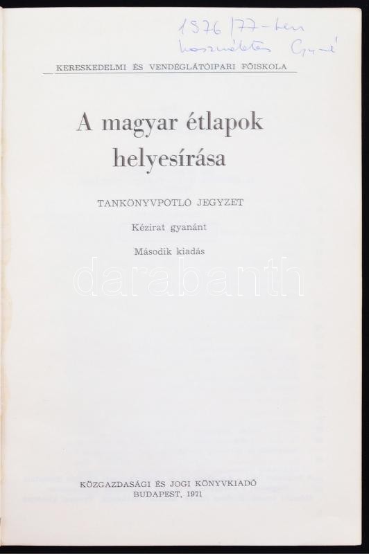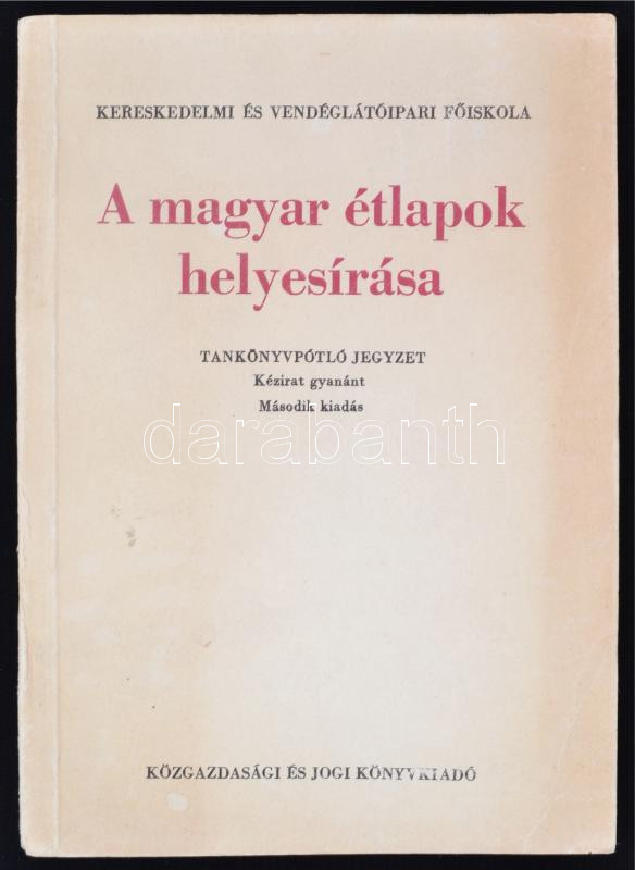 Kaszab Andor: A magyar étlapok helyesírása. Tankönyvpótló jegyzet. Második kiadás. Bp., 1971, Közgazdasági és Jogi. 137 p. Kiadói papírkötésben, jó állapotban. A címlapon tulajdonosi bejegyzés.