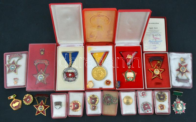 20db vegyes szocialista jelvény, kitüntetés főleg tokokkal, közte "Csongrád Megyei Tanács - Társadalmi Munkáért" aranyozott fém jelvény, "Kiváló Dolgozó" és "Szocialista Brigád" kitüntetések miniatűrrel T:vegyes