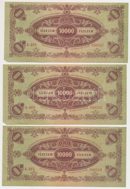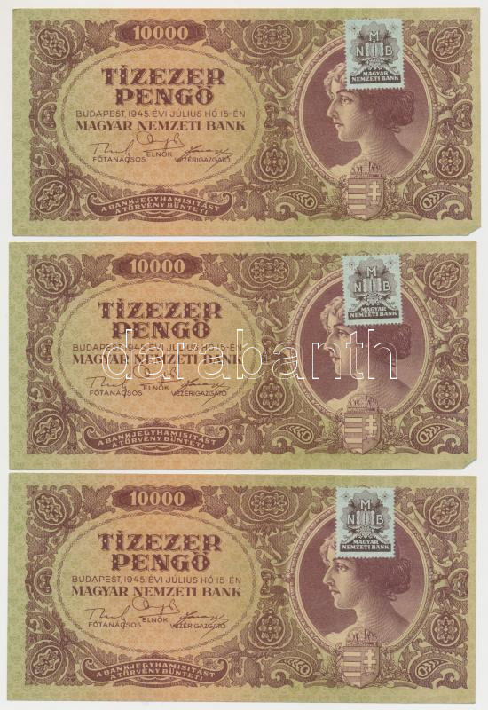 Beschreibung: 1945. 10.000P (3x) sorszámkövetők két ugrással, mindhárom "MNB" bélyeggel T:I-
