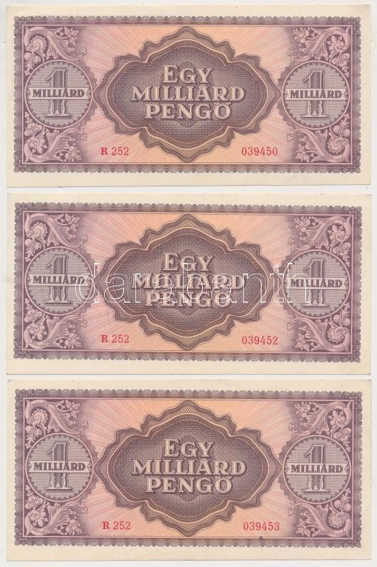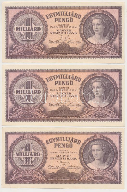 1946. 1.000.000.000P (3x) sorszámkövetők T:I-,II https://www.darabanth.com/de/258-Fernauktion/258.0/Numismatik/Ungarische-Banknoten~400007/1946-1000000000P-3x-sorszamkovetok-TI-II~II1266345